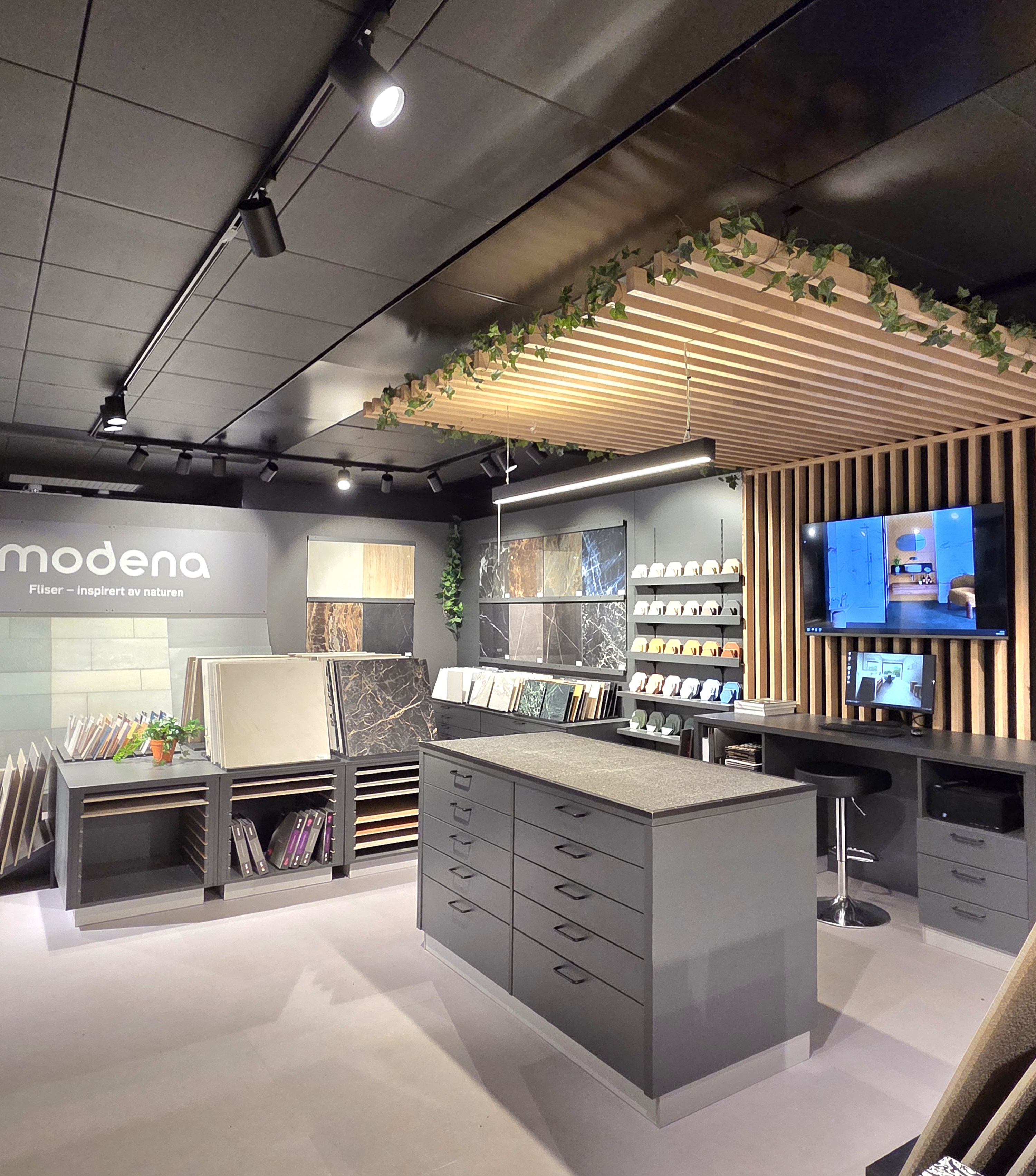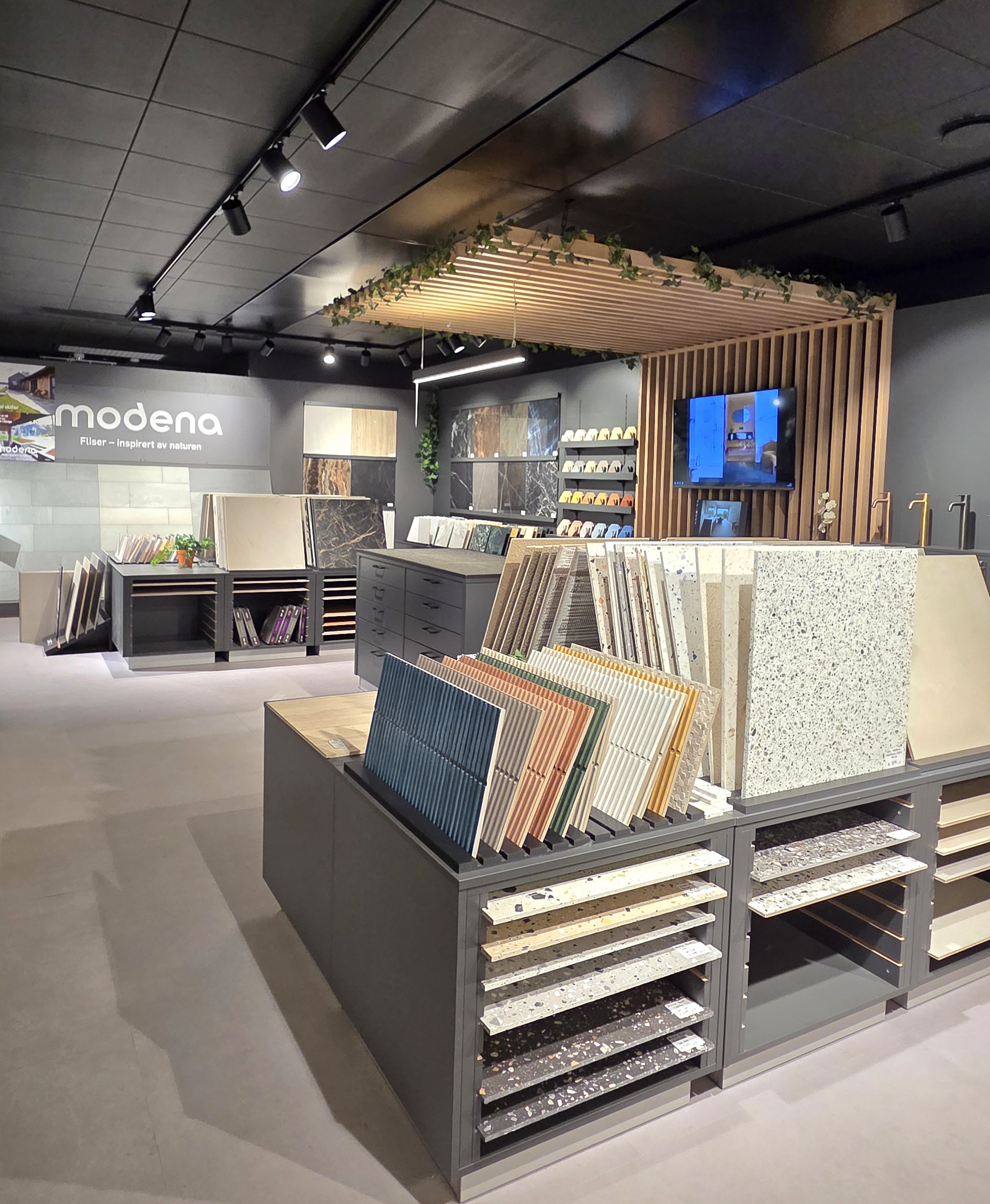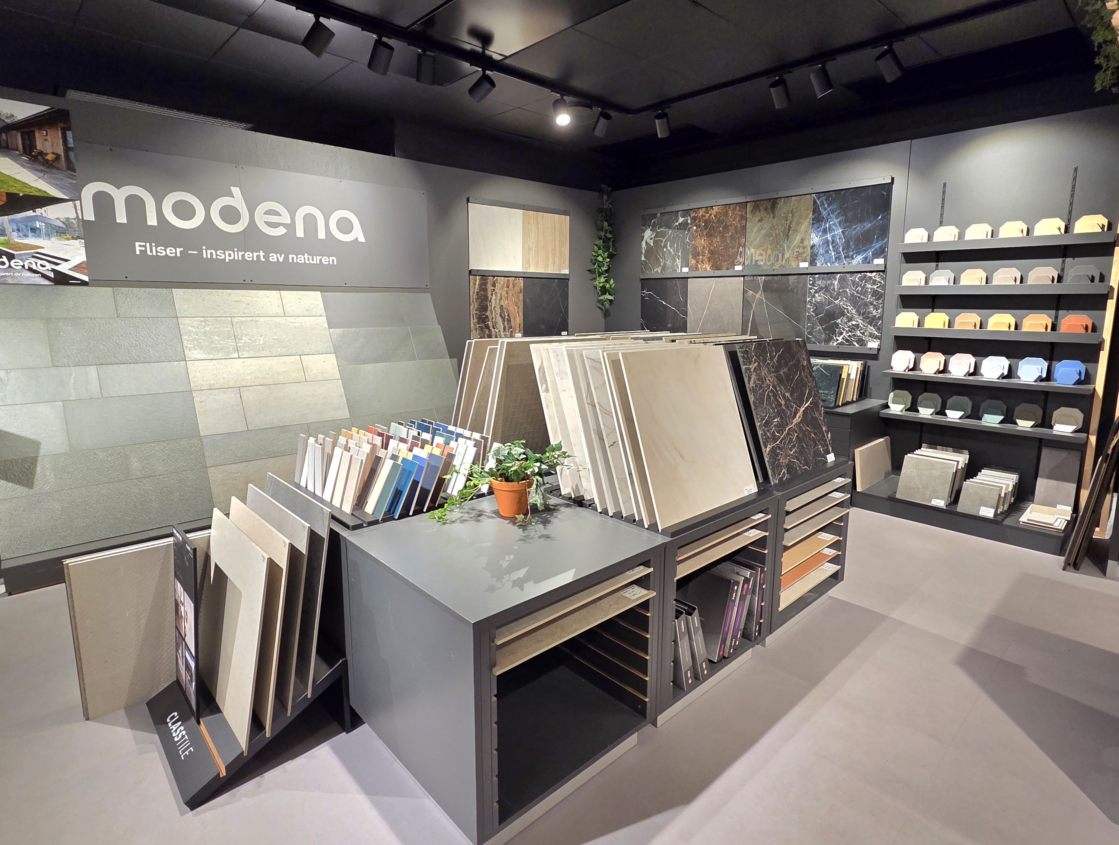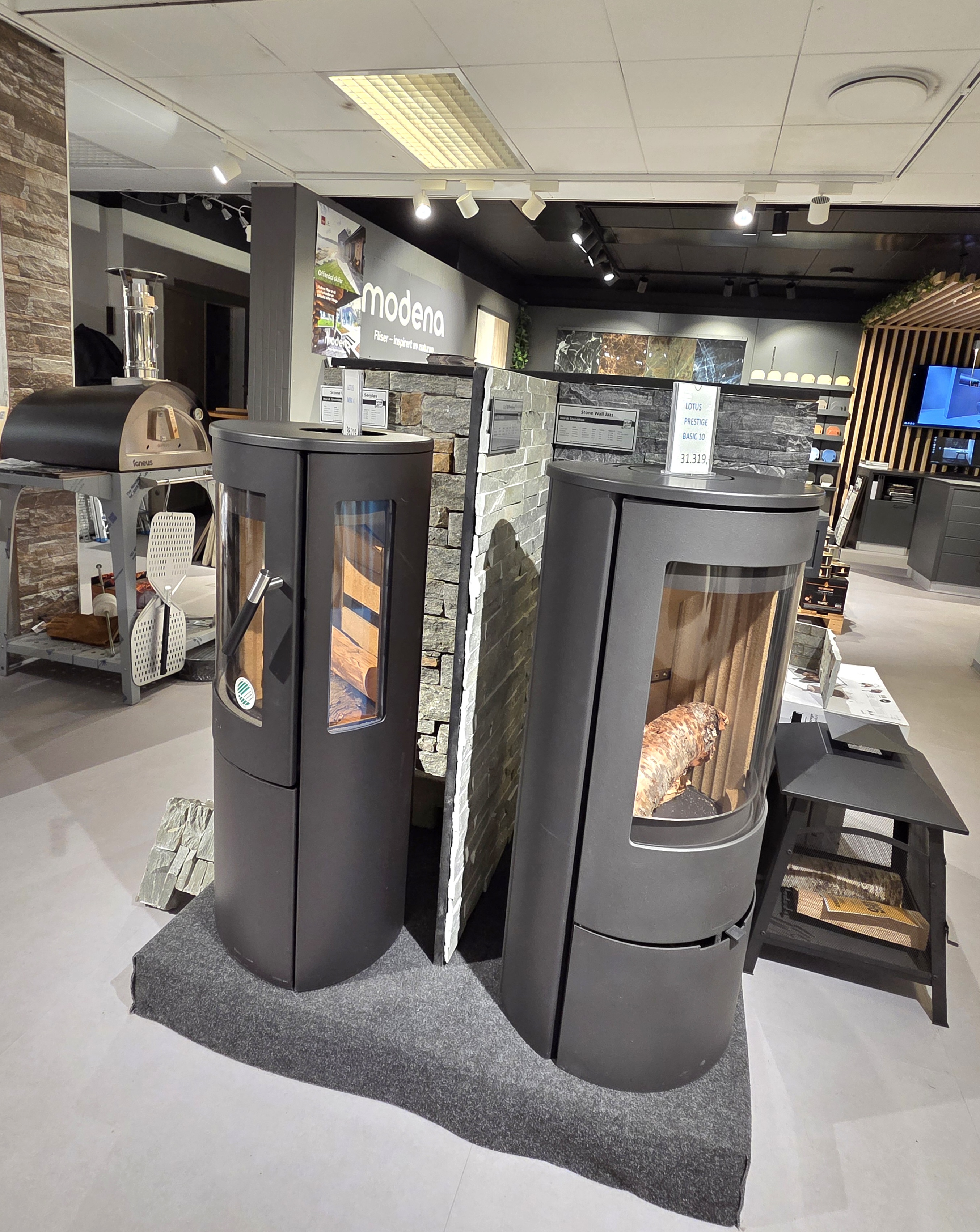 Her finner du flotte utstillinger av fliser og peisovner.
