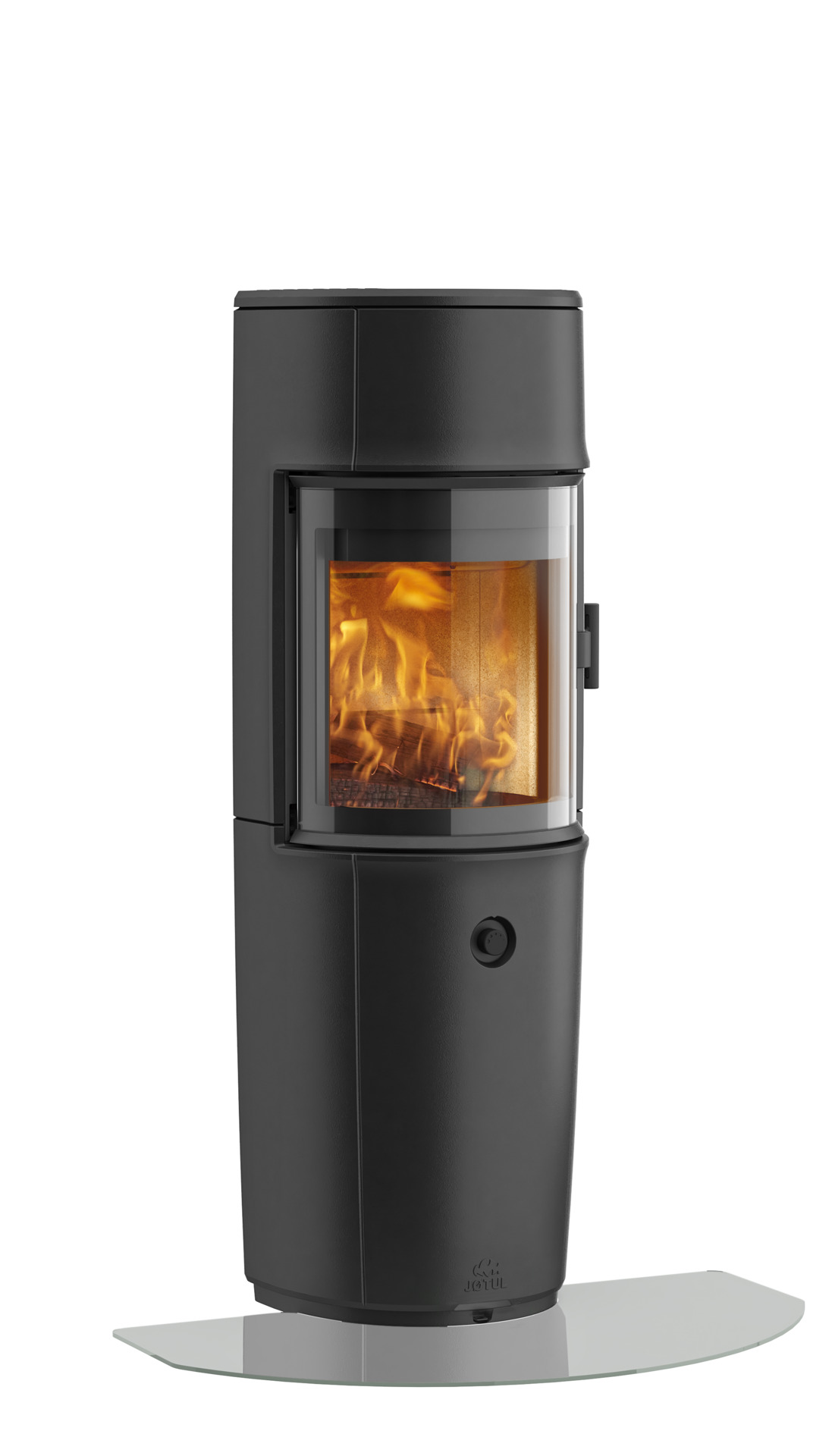 - Stor buet glassdør med bredt innsyn til flammene