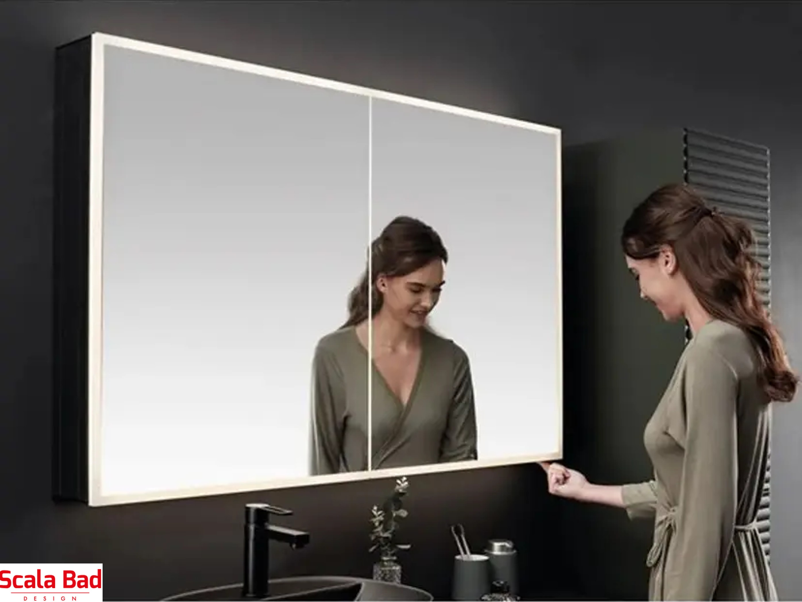 Tidsriktig sort speilskap med LED belysning. Vi har utviklet Lucca sort speilskap med speil på innsiden av dør, justerbare glasshyller og 2 x stikkontakter med USB. Lucca har LED overlys, underlys, belysning i topp i skapet og LED belysning rundt hele speilkanten. Lucca speilskap har integrert Bluetooth™ og høyttalere.
