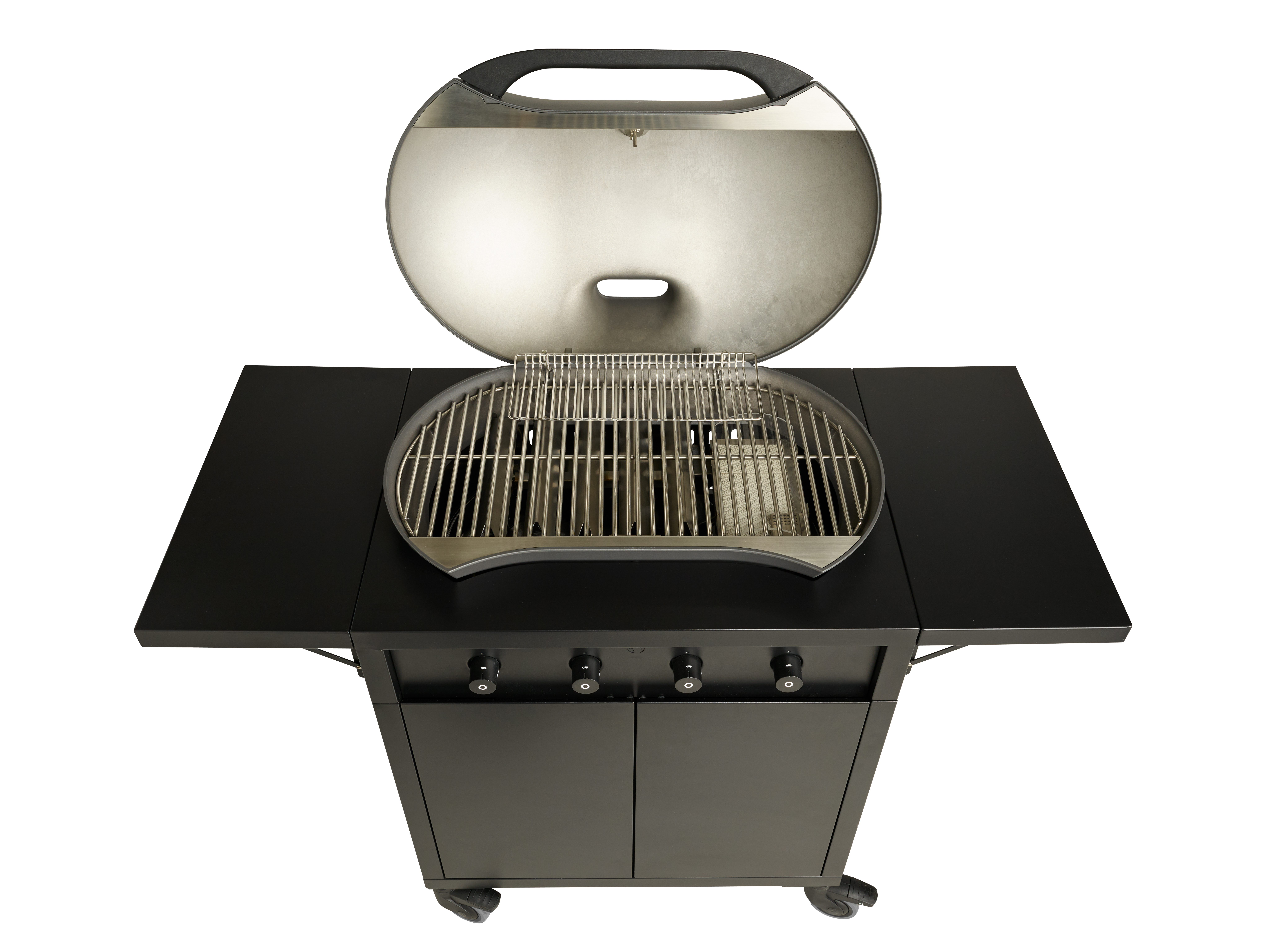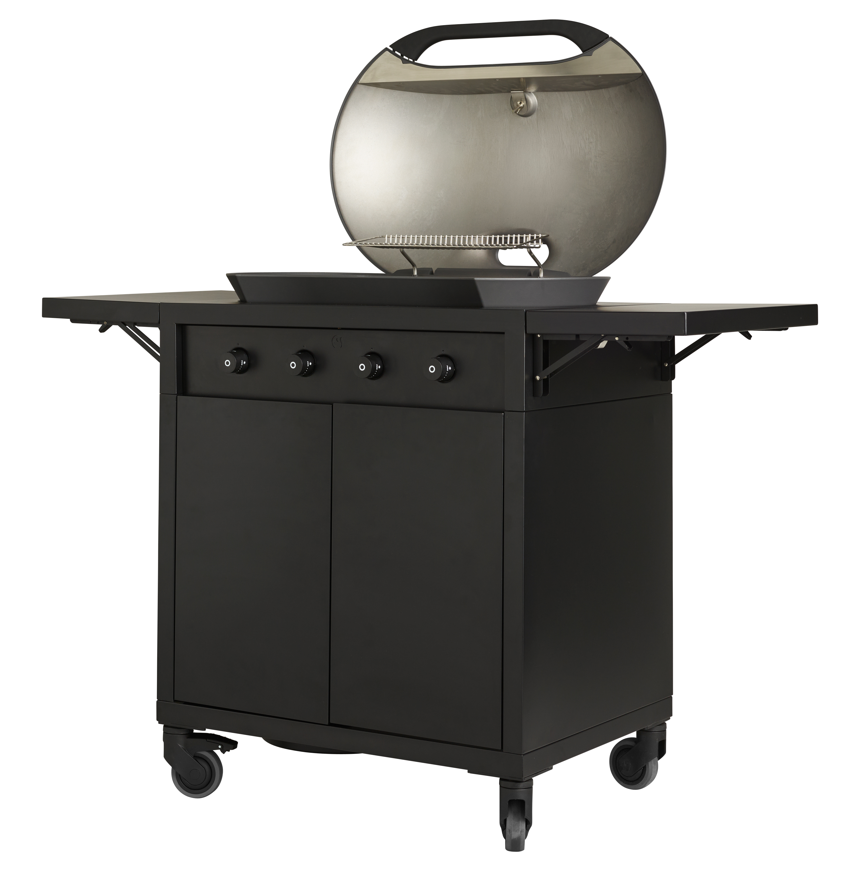 Den robuste Ø8 mm grillristen i rustfritt stål (AISI 304) sørger for jevn varmefordeling og god varmelagring. To sammenleggbare sidebord gir nødvendig arbeidsplass ved behov, mens den integrerte og avtagbare brødhyllen, justerbar i to høyder, gir ekstra fleksibilitet under matlagingen.