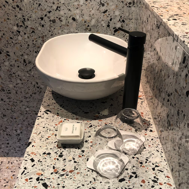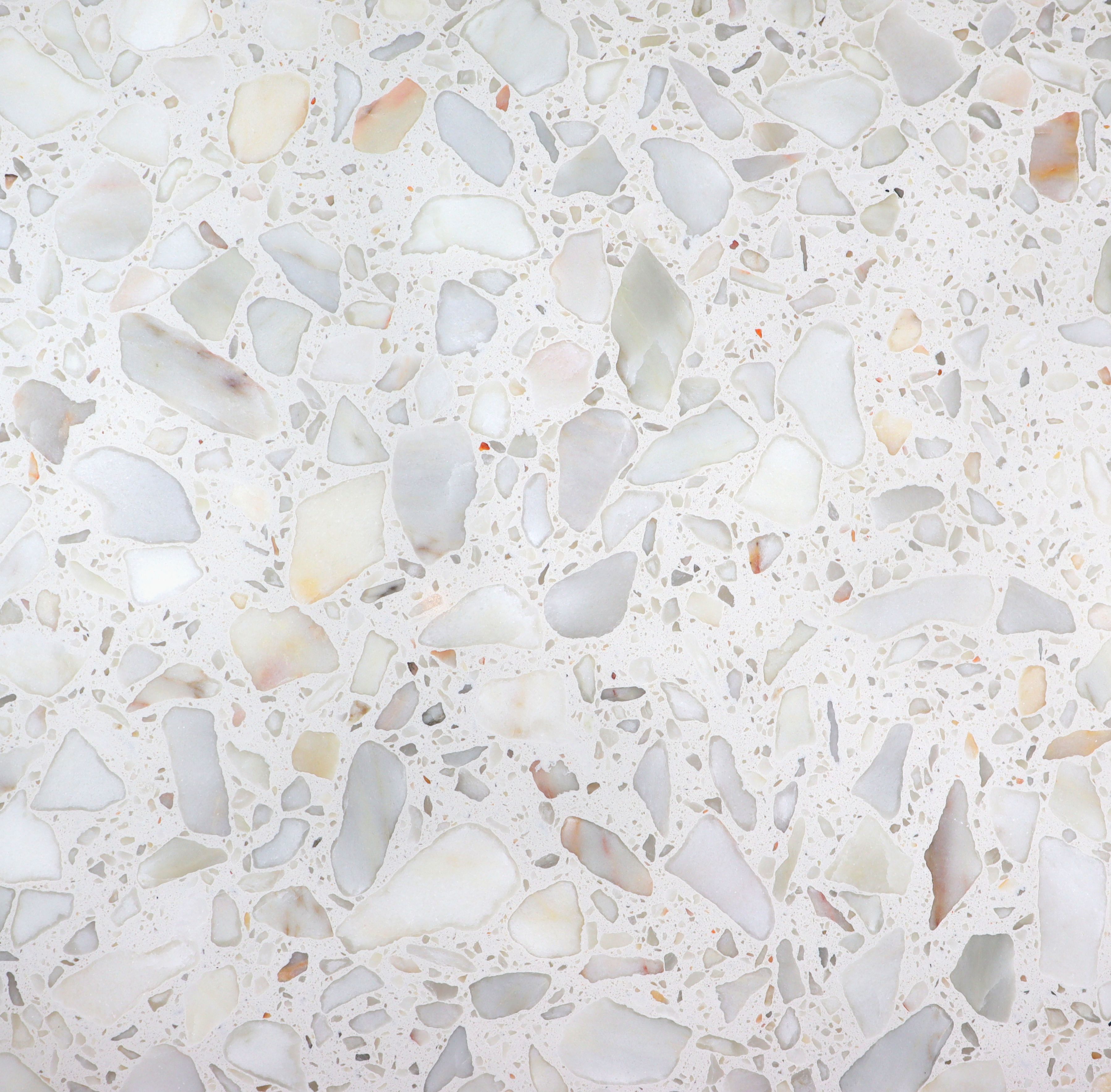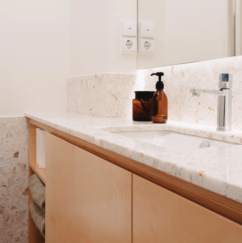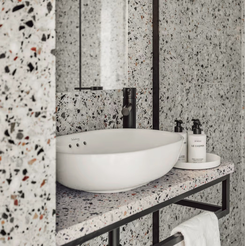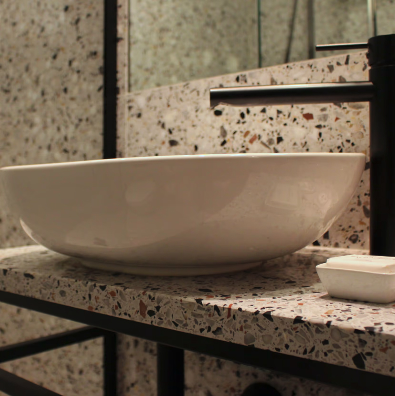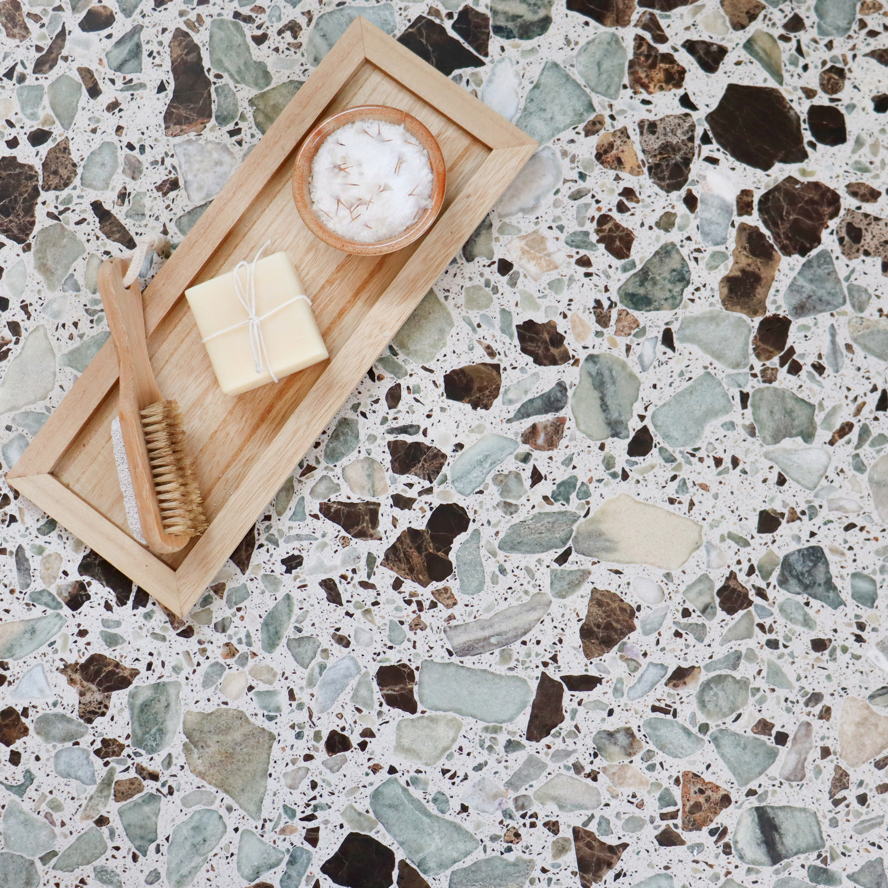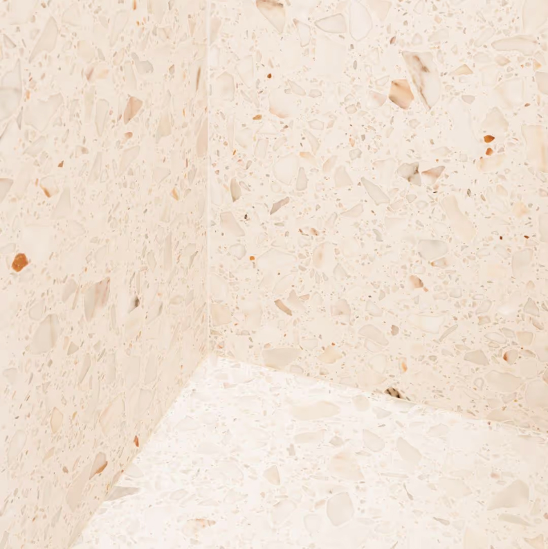 RMC Kompakt Resin Terrazzo er et slitesterkt og lettstelt materiale laget av 95% naturlig marmor, tilgjengelig i en rekke farger, tykkelser og formater - også som "Cut-to-size". Det gjennomgående mønsteret og det lave vannoppsuget gjør materialet ideelt for alt fra bad og våtrom til moderne overflater i hele hjemmet.
