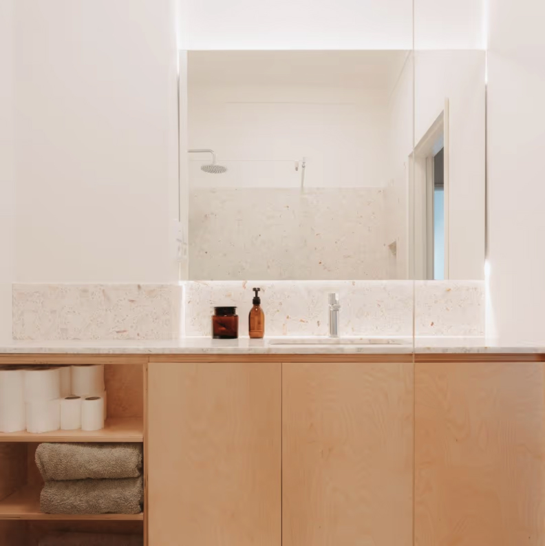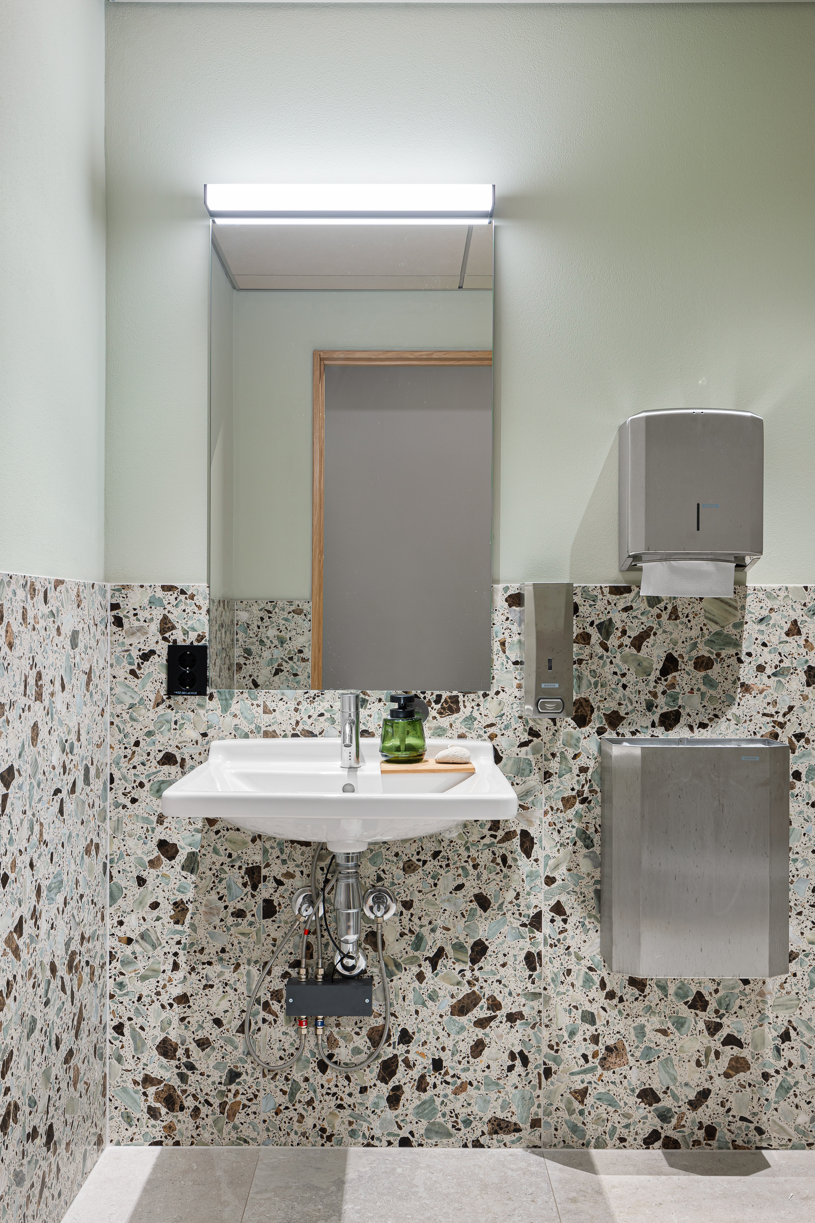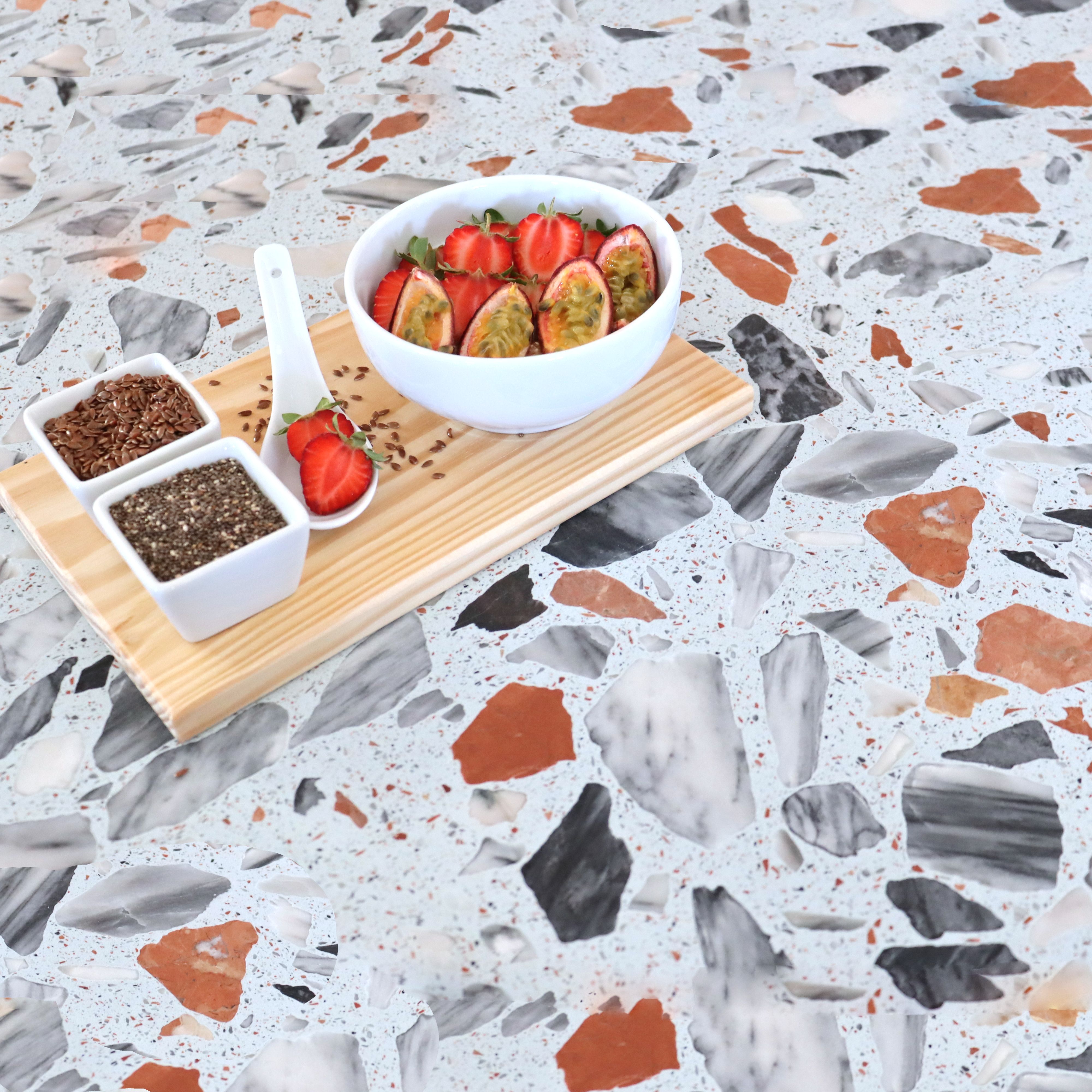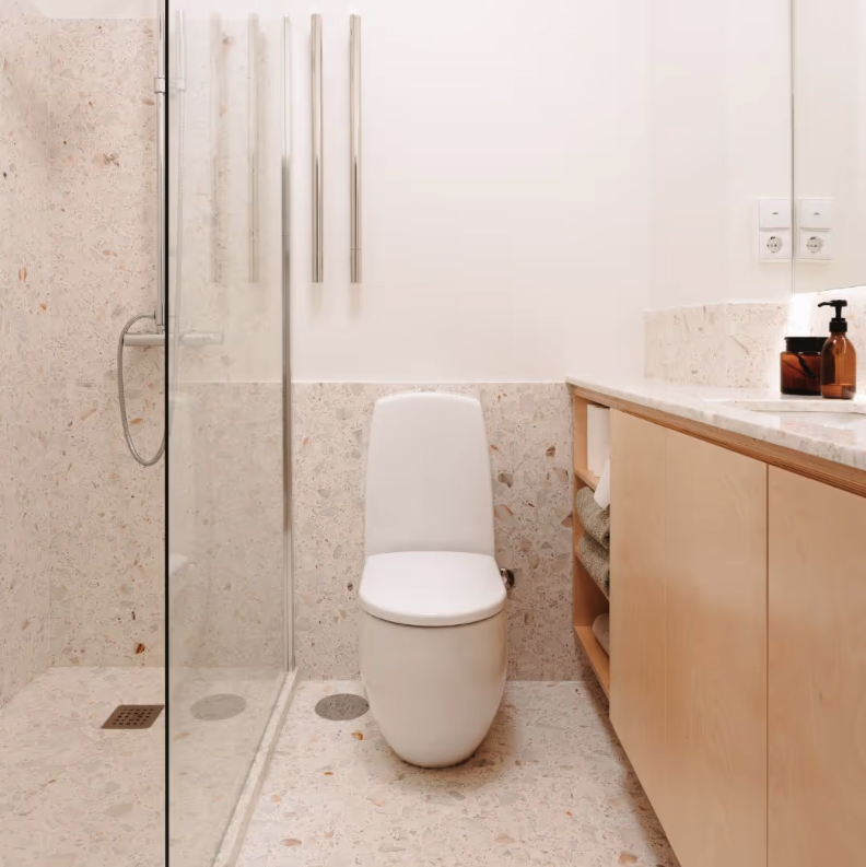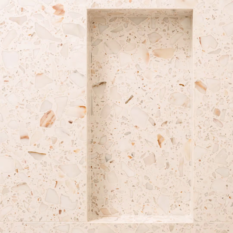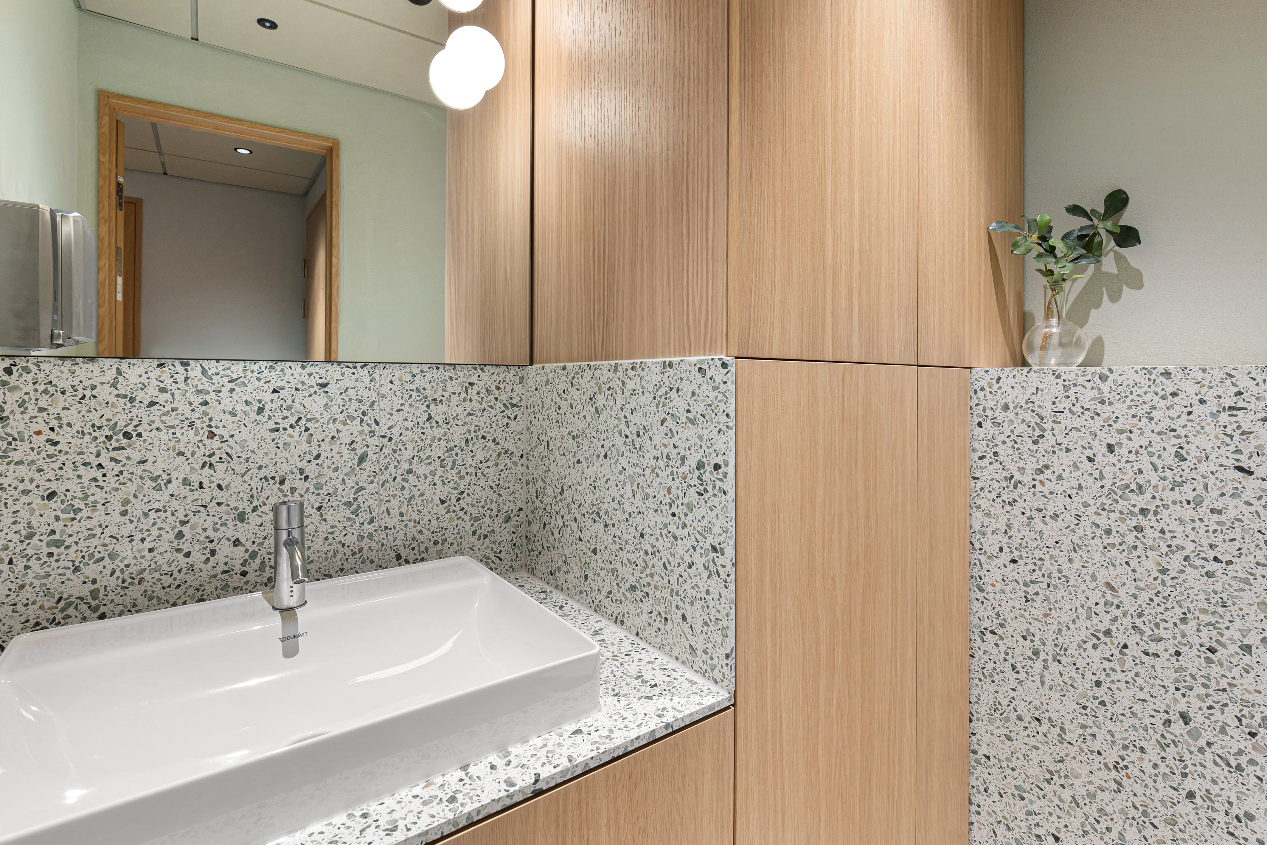 RMC Kompakt Resin Terrazzo er et slitesterkt og lettstelt materiale laget av 95% naturlig marmor, tilgjengelig i en rekke farger, tykkelser og formater - også som "Cut-to-size". Det gjennomgående mønsteret og det lave vannoppsuget gjør materialet ideelt for alt fra bad og våtrom til moderne overflater i hele hjemmet.