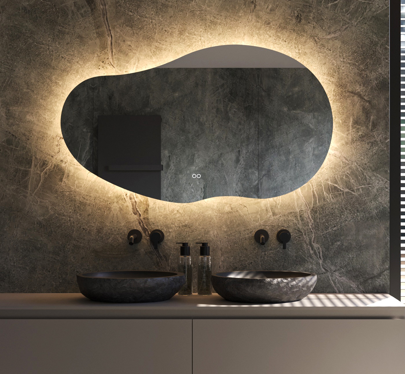 Ett lekkert og moderne baderom speil med organisk form. Speilet har lys i bakkant (Backlight). Det kan dimmes og har fargejustering fra varmt til kaldt lys. Anti dugg er standard med egen touch sensor.