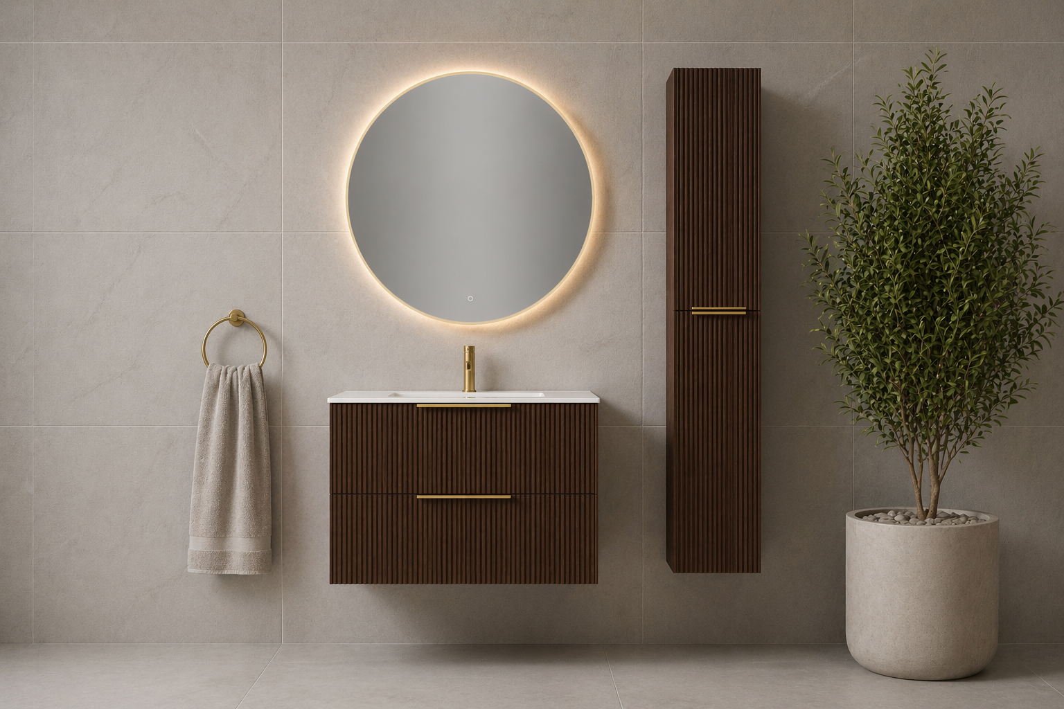 Servantskapene kommer i 60, 80, 100 og 120 cm bredde, og passer like godt i små og store baderom. Et høyskap på 35 cm gir ekstra oppbevaring uten å ta mye plass.