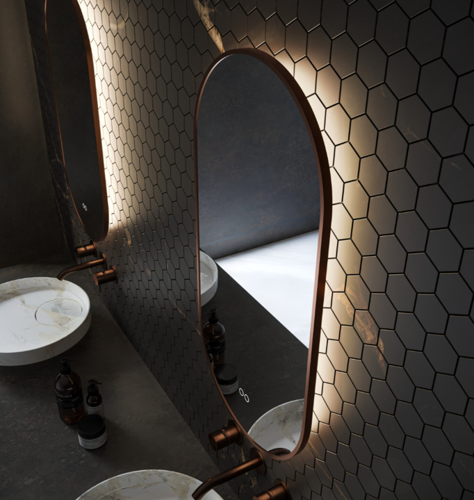 Oppgrader baderommet med Saga speil med baklys, en perfekt kombinasjon av moderne teknologi og tidløst design. Speilet leveres med en elegant ramme i børstet kobber utført i slitesterk PVD-finish – en avansert overflatebehandling som gir økt motstandsdyktighet mot riper, korrosjon og misfarging. Resultatet er et speil som holder seg like vakkert år etter år.