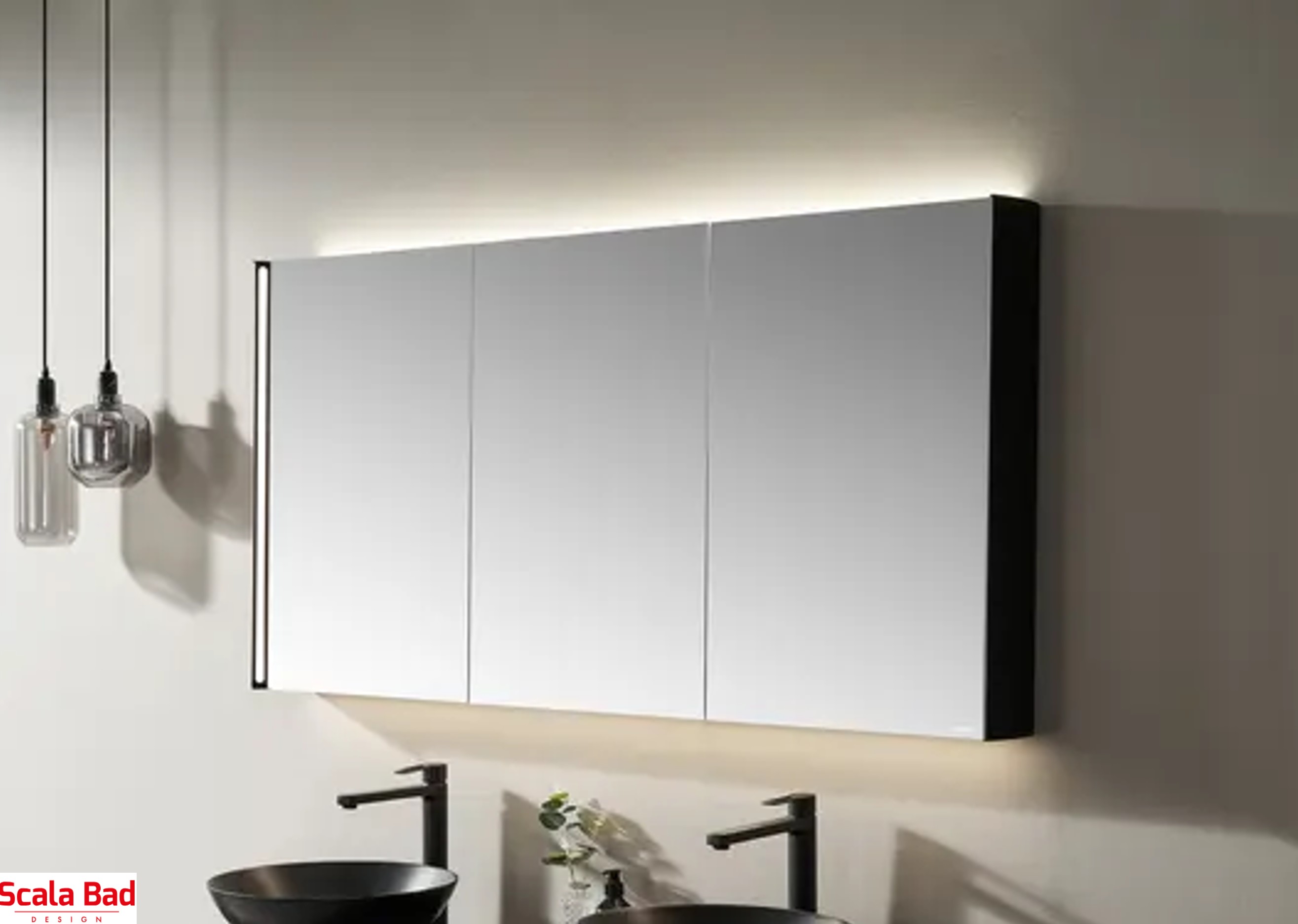 Selve skapet og sideprofilene er i Sort Matt eller Hvit Matt. Sort utførelse har skjult "Ghost Light" LED belysning bak sidedekslene. Burano har overlys, underlys og belysning innvendig i skapet. 2 x stikkontakter og USB kontakt. Speil på innsiden av dørene. Justerbare glasshyller. Integrert Bluetooth™ og høytaller.