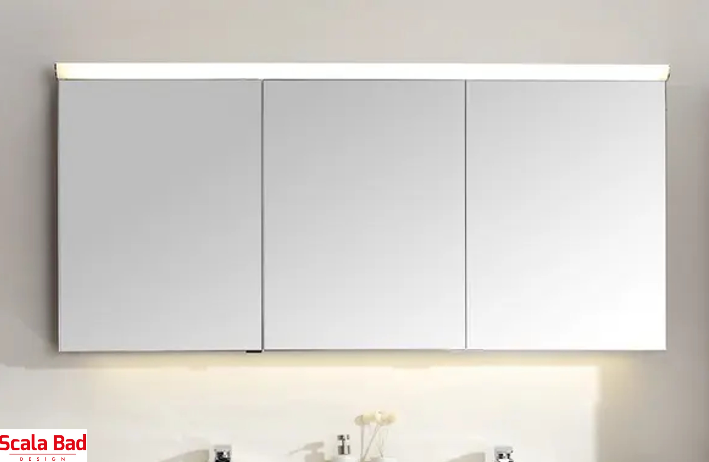 CAPRI-speilskap 150 cm bredde med LED-underlys og 2 stikkontakter inne i skapet. Varm og god belysning. Justerbare glasshyller og speil på innsiden av dørene. AV/PÅ bryter på innsiden av skapet. Speilskap i grå eloksert aluminium. Flott utseende. 3 dører