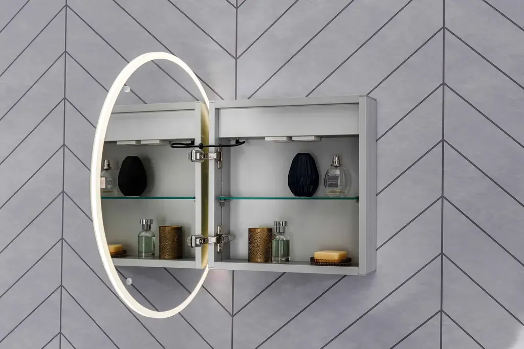 Vi har utviklet Lugano runde speilskap med LED belysning, speil på innsiden av dør, justerbare glasshyller og 2 x stikkontakter med USB. Lugano 60 har venstre hengslet dør. Lugano 90 har henglser i midten. du åpner en dør av gangen.
