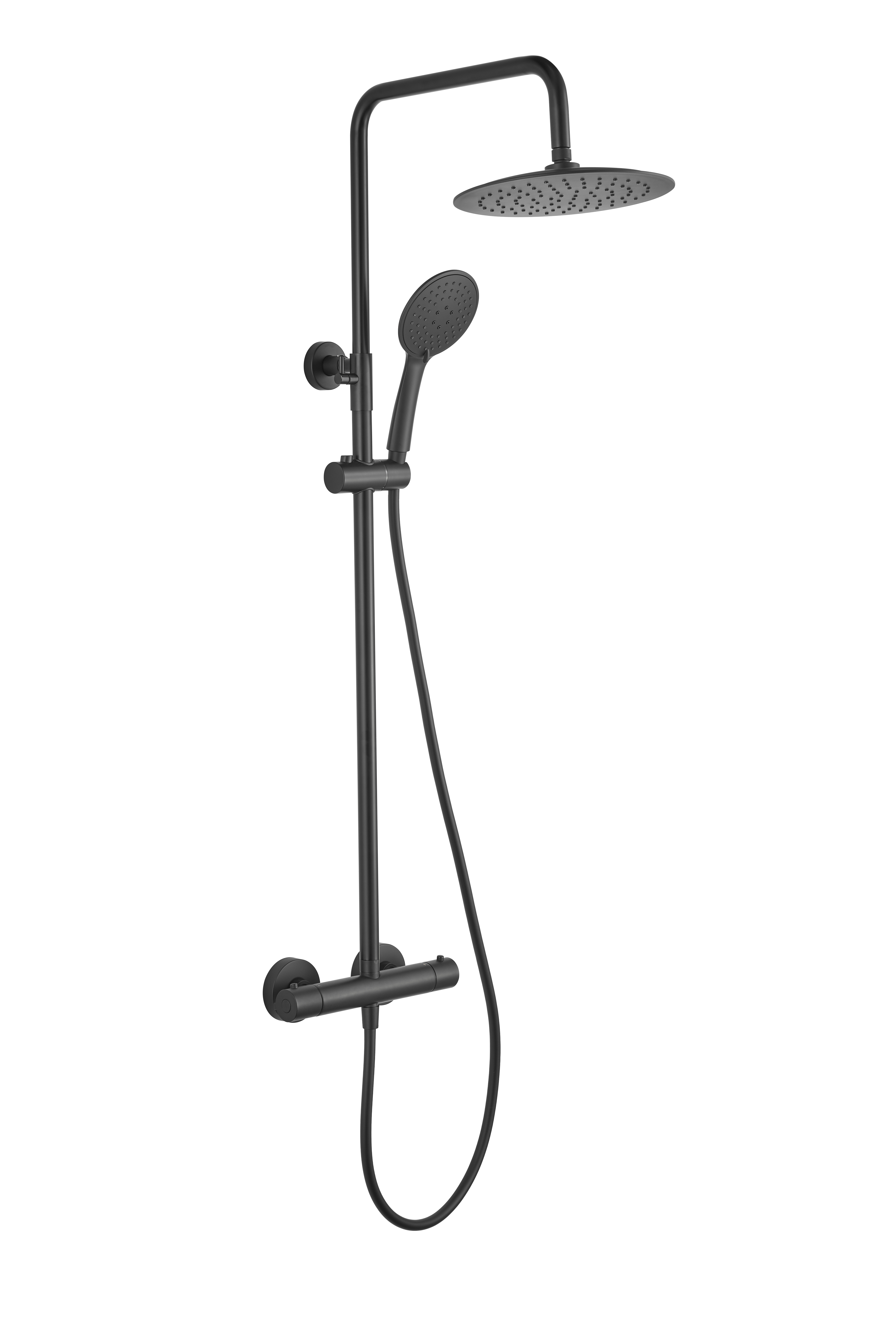 Komplett takdusj, inkludert termostatarmaturer. Takdusjen har justerbar høyde fra 850-1110mm. Dusjhode Ø225 mm. Inkludert sorte rosetter. Sort matt utførelse. SINTEF godkjent.